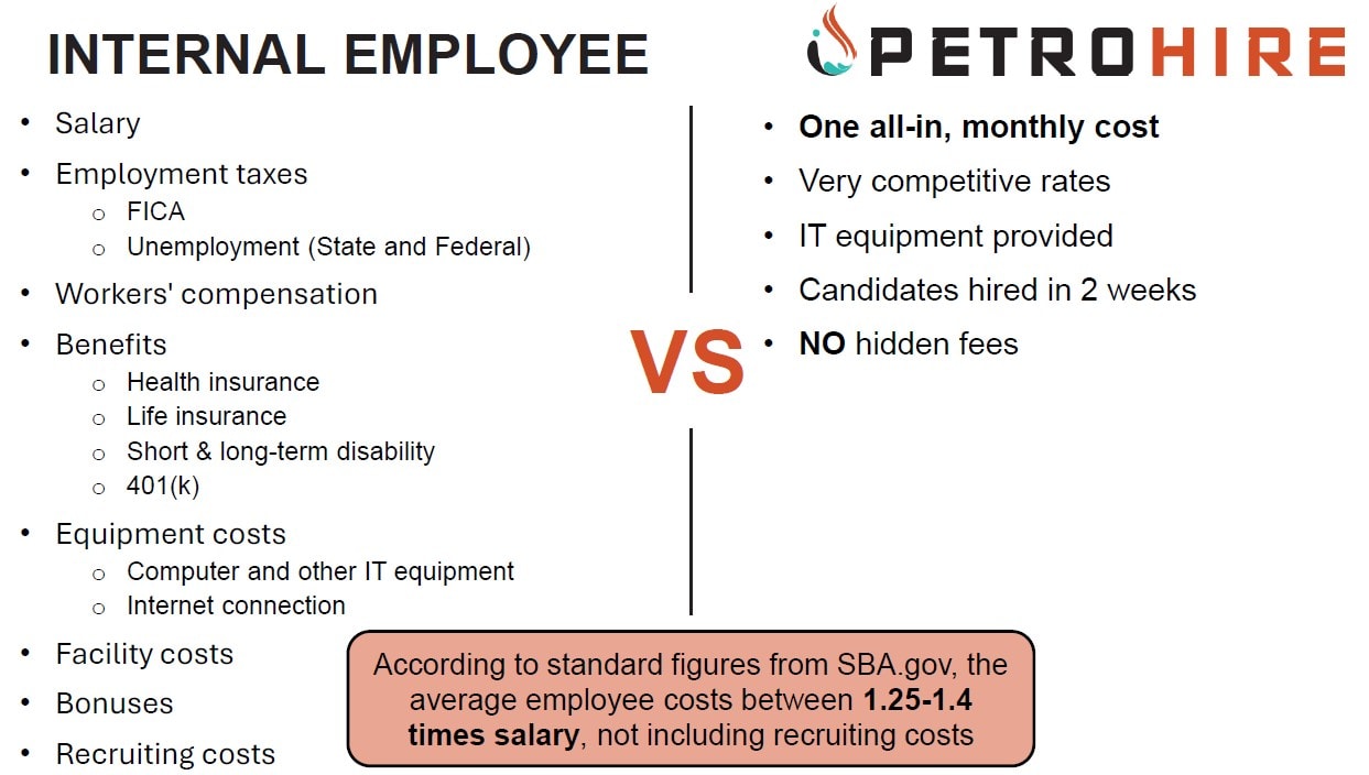 The numbers don’t lie. According to PetroHire data, clients save an average of 30–40% when compared to traditional U.S.-based hiring.